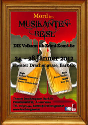 Im Wiener Theater Drachengasse ist seit 24. Januar die österreichische Erstaufführung der musikalischen Farce „Mord im Musikantenbeisl“ zu sehen. Die Show läuft so erfolgreich, dass man die Spielserie um zwei Tage verlängert hat. Zum lustigen Mörderraten darf man sich nun auch noch am kommenden Donnerstag und Freitag, am 2. und 3. Februar, einfinden.